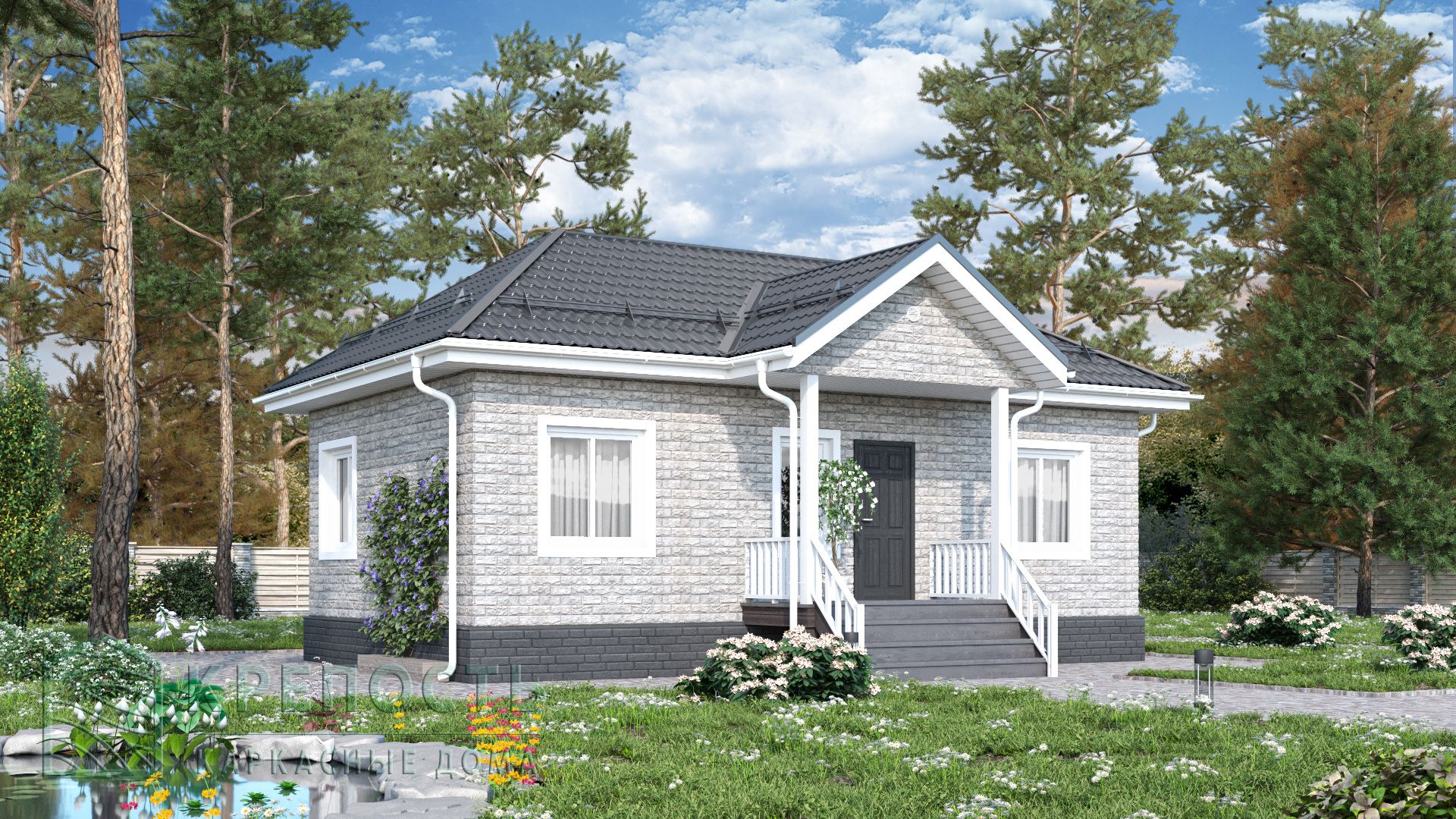 Практичный одноэтажный каркасный дом, размером 6x10 м., с вальмовой кровлей и крыльцом перед входом. Дом для небольшой семьи, с комфортной планировкой. Просторное помещение кухни-гостиной, две спальные комнаты, совмещенный санузел и небольшой. Удобная и функциональная планировка делают этот проект дома очень популярным. Внешняя отделка дома - виниловыми панелями с имитацией камня. По желанию Заказчика, вариант отделки может меняться.