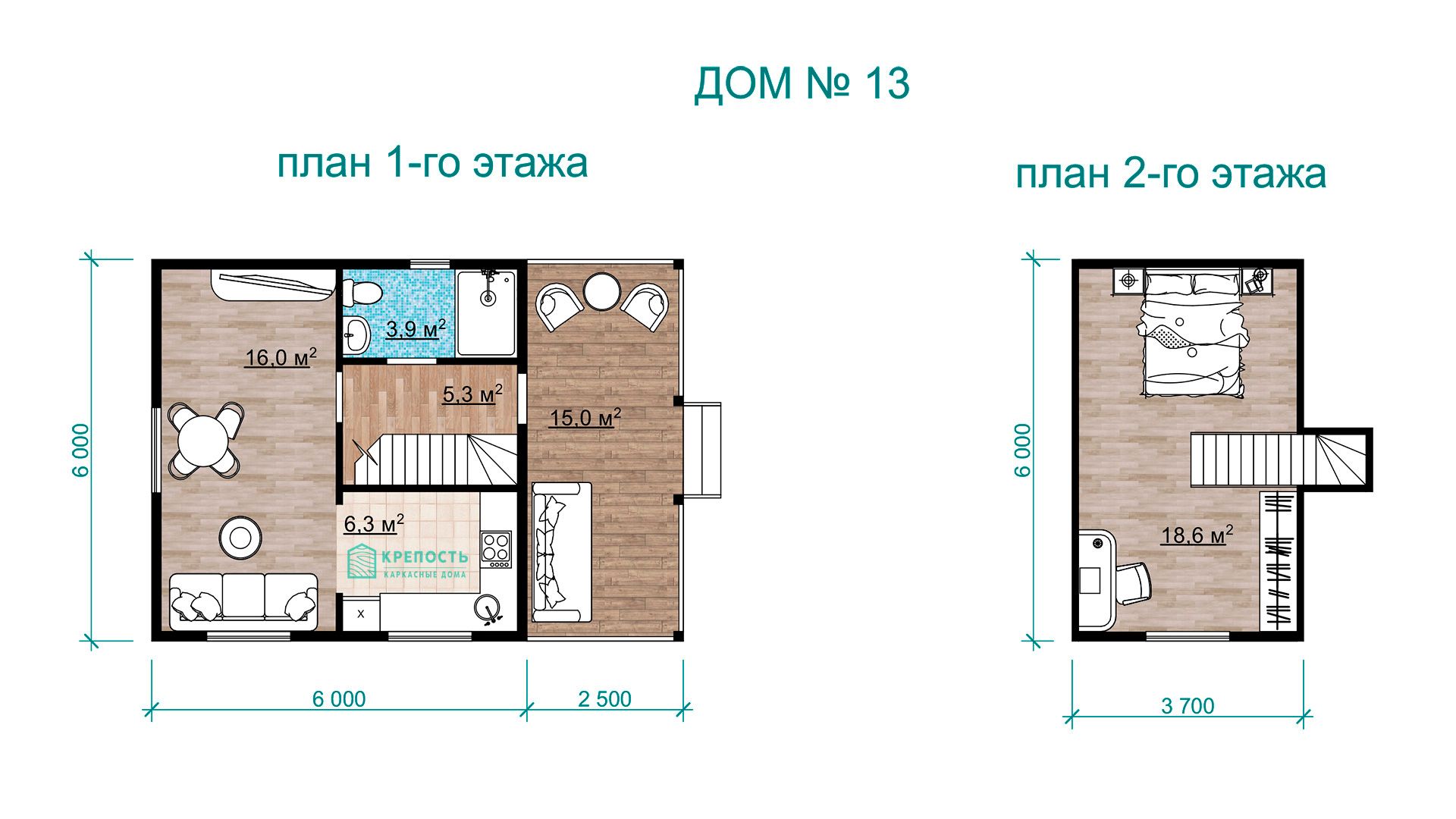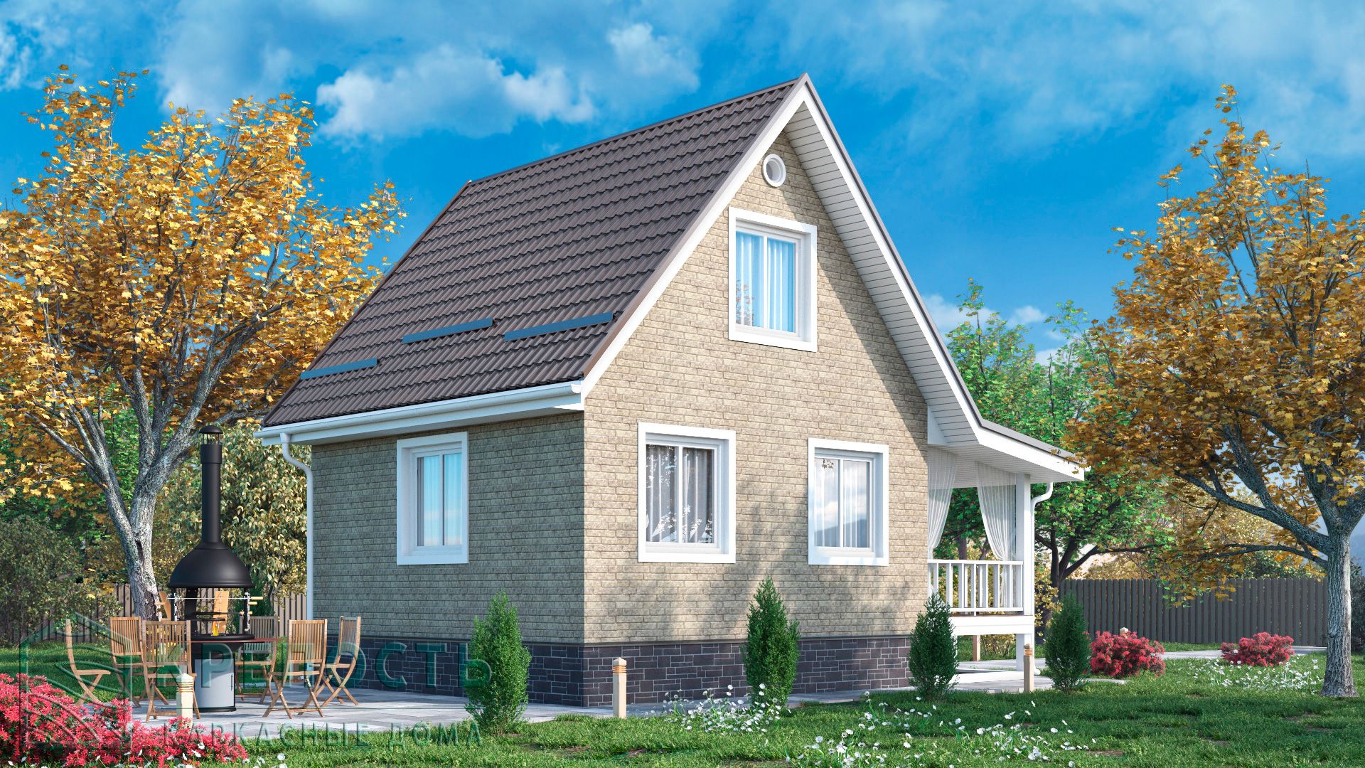 Компактный двухэтажный каркасный дом, размером 6х6 м., с мансардными скосами на втором этаже, с эргономичной планировкой, с двухскатной кровлей и комфортной террасой. Максимум полезной площади и удобное расположение помещений. На первом этаже – единое пространство кухни-гостиной, совмещенный санузел и холл с межэтажной лестницей. А на втором этаже – комфортная спальня на весь этаж. Такой дом подойдет для убежденного холостяка или комфортного проживания семейной пары.