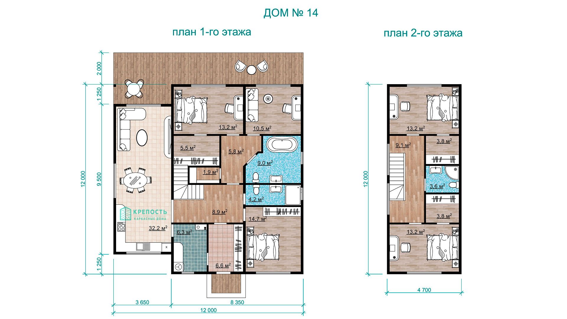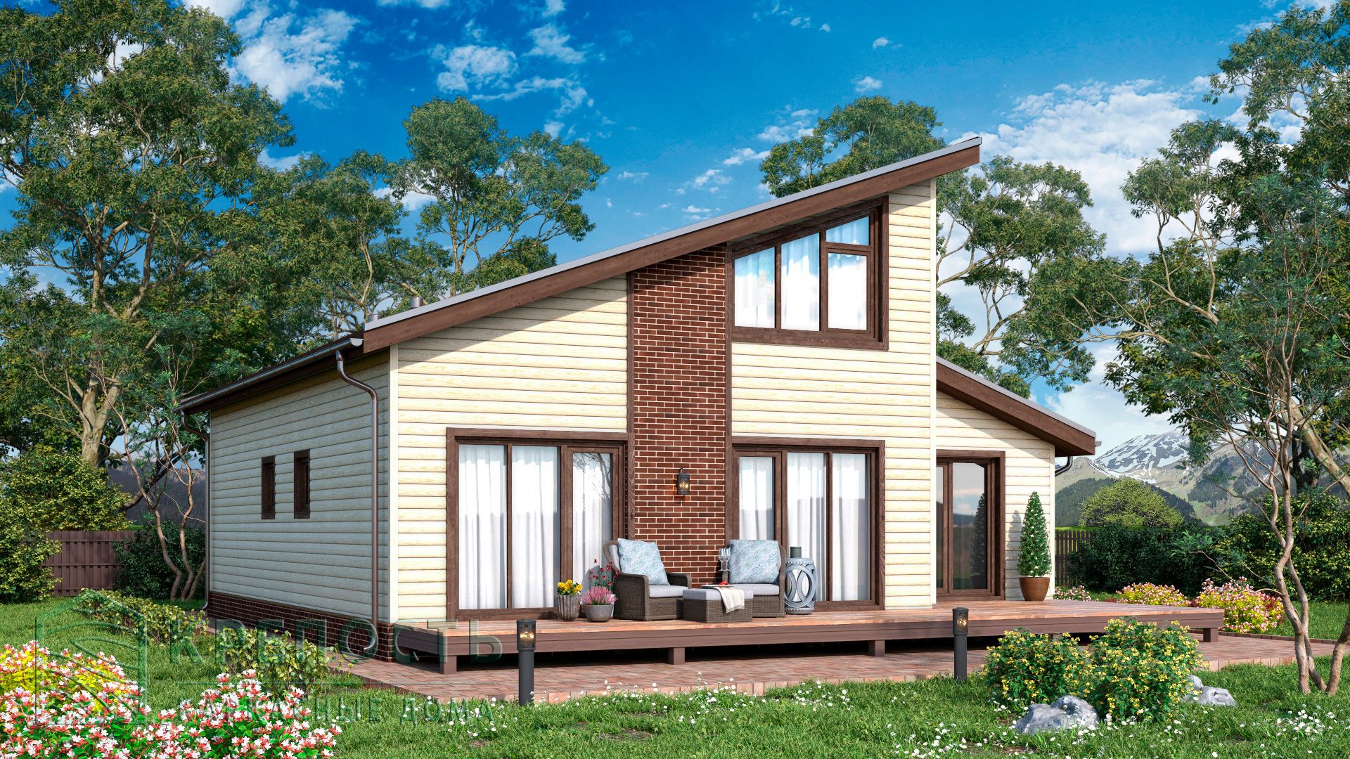 Большой просторный двухэтажный каркасный дом, размером 12х12 м., с мансардным скосом на втором этаже, с эргономичной планировкой, с двухскатной кровлей, крыльцом перед входом и комфортной террасой. Максимум полезной площади и удобное расположение помещений. На первом этаже – единое пространство кухни-гостиной, с выходом на террасу, две спальни, кабинет, два санузла и холл с межэтажной лестницей. А на втором этаже – небольшой холл, две спальные комнаты с гардеробными, а также, для удобства, на втором этаже расположен санузел. Такой дом подойдет для комфортного проживания даже большой семьи из 5-6 человек. Внешняя отделка дома - виниловый сайдинг «Корабельный брус». По желанию Заказчика, вариант отделки дома можно изменить.