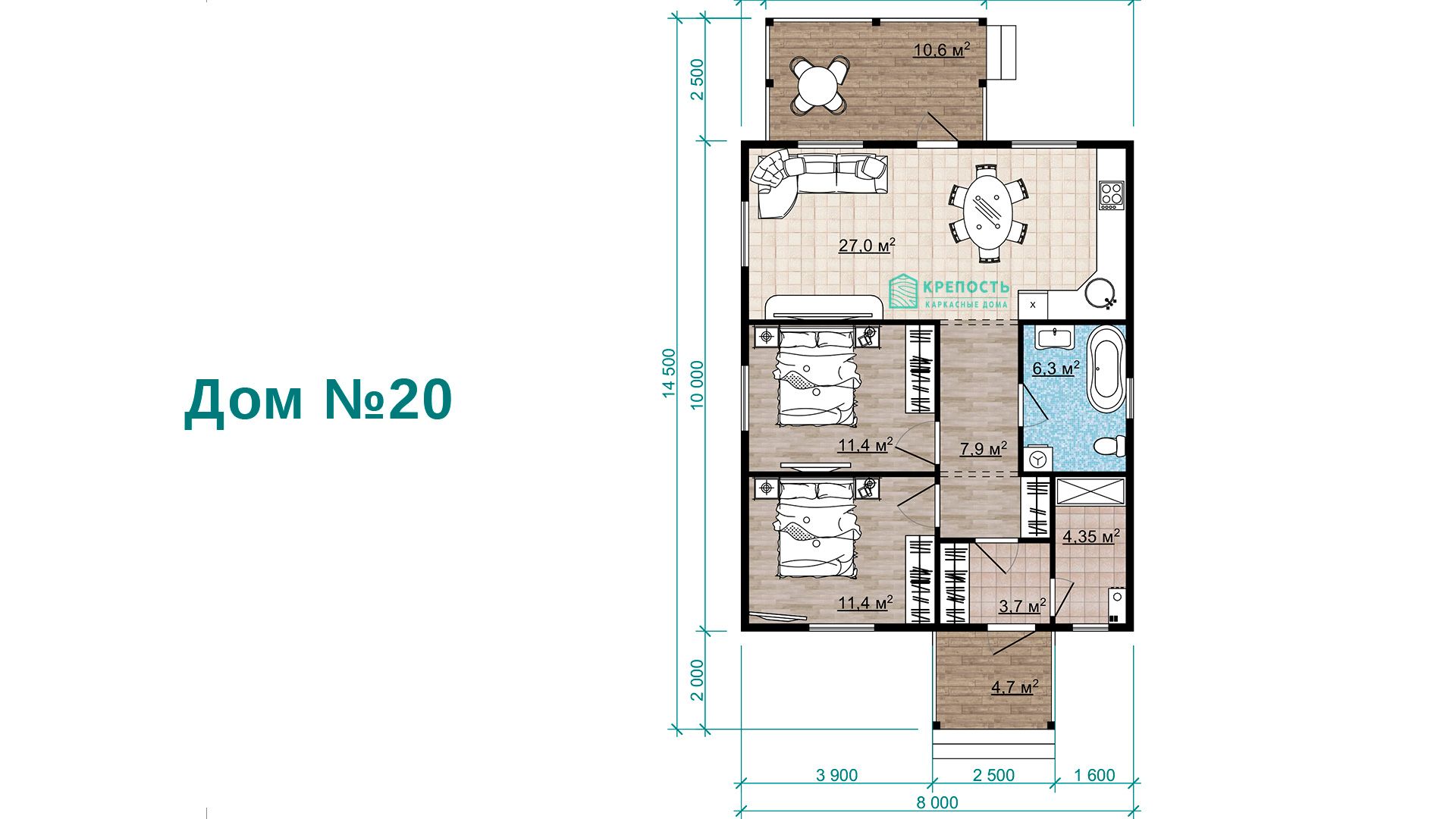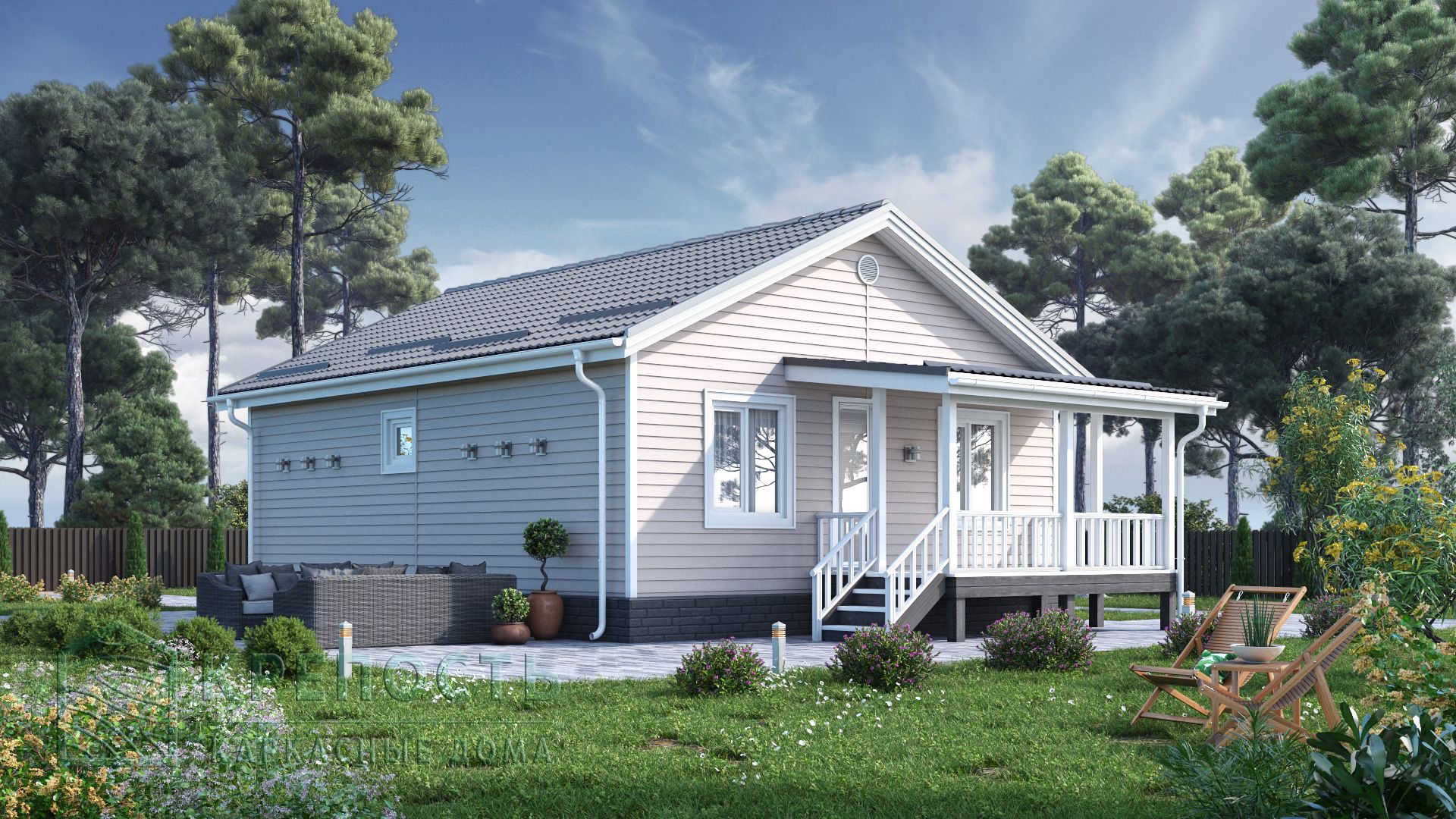 Проект одноэтажного каркасного дома, размером 10х8 м. Максимум полезной площади и удобное расположение помещений. В доме имеется кухня-гостиная, санузел и две уютных спальни. Такой дом подойдет для комфортного проживания небольшой семьи. Внешняя отделка дома сайдинг. По желанию Заказчика, вариант отделки дома можно изменить.