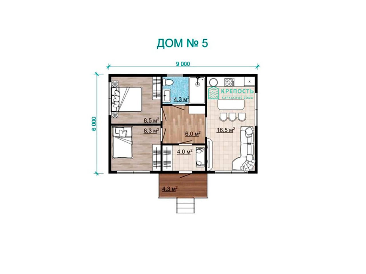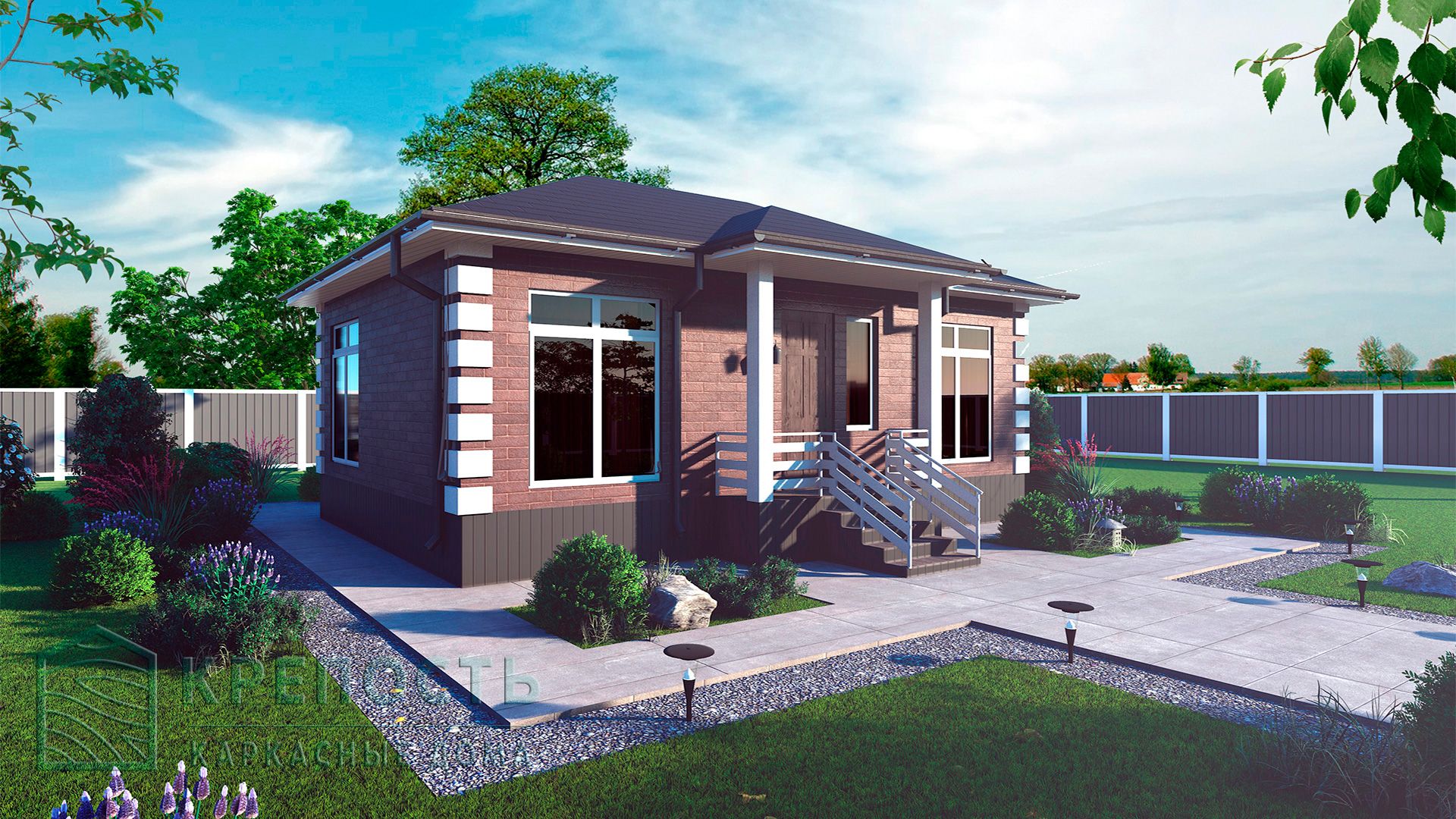 Одноэтажный каркасный дом, размером 6x9 м., с витражным остеклением, вальмовой кровлей и крыльцом перед входом. Дом для небольшой семьи, с практичной планировкой. Единое пространство кухни-гостиной, две спальные комнаты, совмещенный санузел, небольшой холл и изолированная прихожая. Удобная и функциональная планировка делают этот проект дома очень популярным. Внешняя отделка дома - виниловыми панелями с имитацией кирпича. По желанию Заказчика, вариант отделки может меняться.