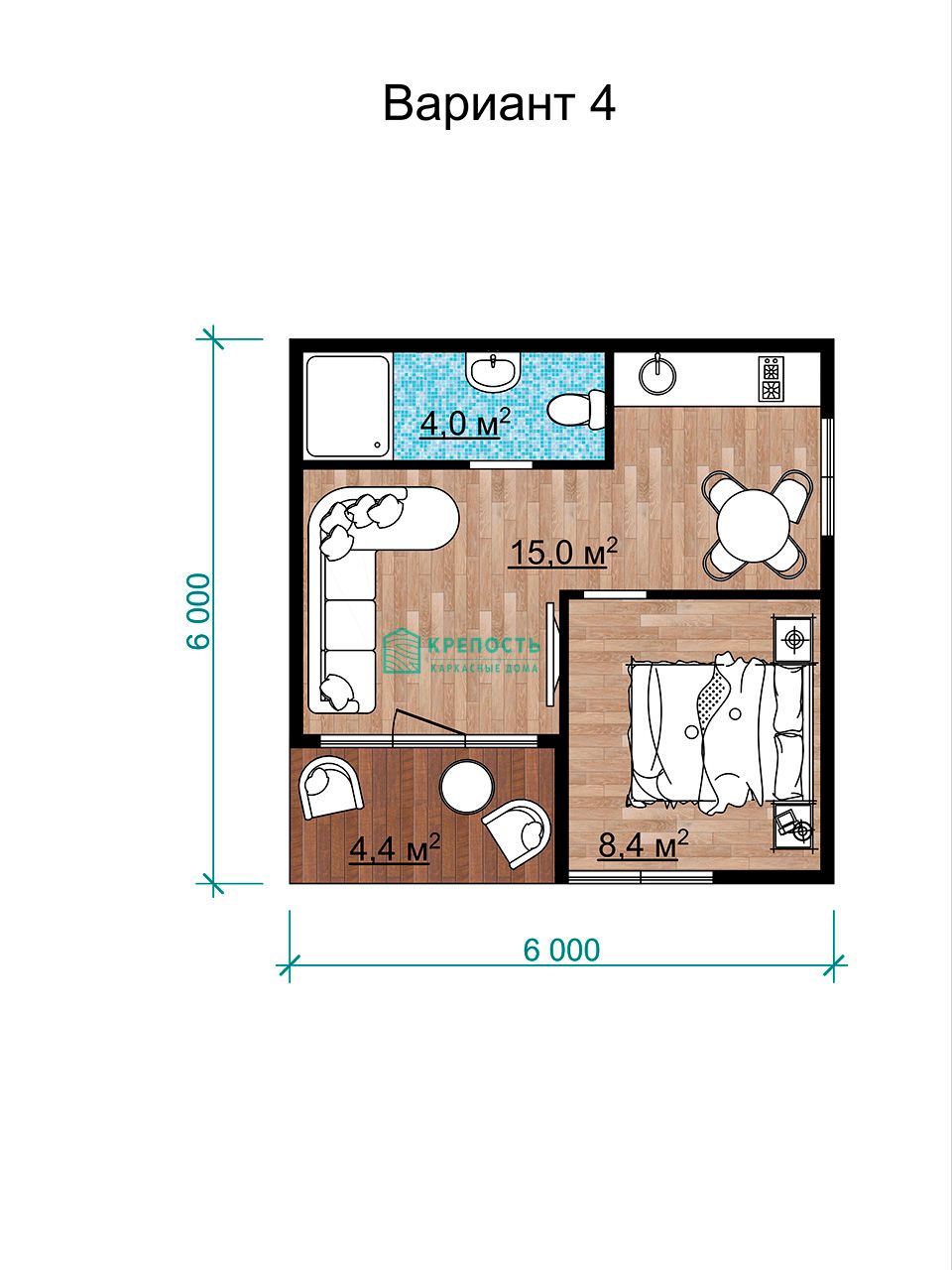 Комфортный одноэтажный дом для отдыхающих, размером 6x6 м., в современном стиле, в интересной архитектурной форме, с трапецевидными витражными окнами, с эргономичной планировкой. Максимум полезной площади и комфортное расположение помещений. На выбор 4 варианта планировки. В каждом из них единое пространство кухни-гостиной, спальная комната и санузел. Небольшая терраса перед входом позволит отдыхающим проводить время на свежем воздухе в комфортной обстановке. Внешняя отделка дома - виниловый сайдинг Docke Lux Брус. По желанию, вариант отделки можно заменить.